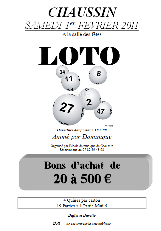 Loto animé par Dominique; 4 Quines par carton. Lots de 20€ à 500€